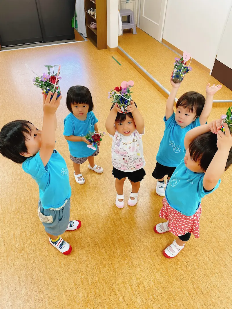 いつも可愛がってくれるおじいちゃんおばあちゃんへプレゼント作り。アンファンでは毎年フラワーアレンジメントを行こないます🌷お花を刺す時のお話しを真…