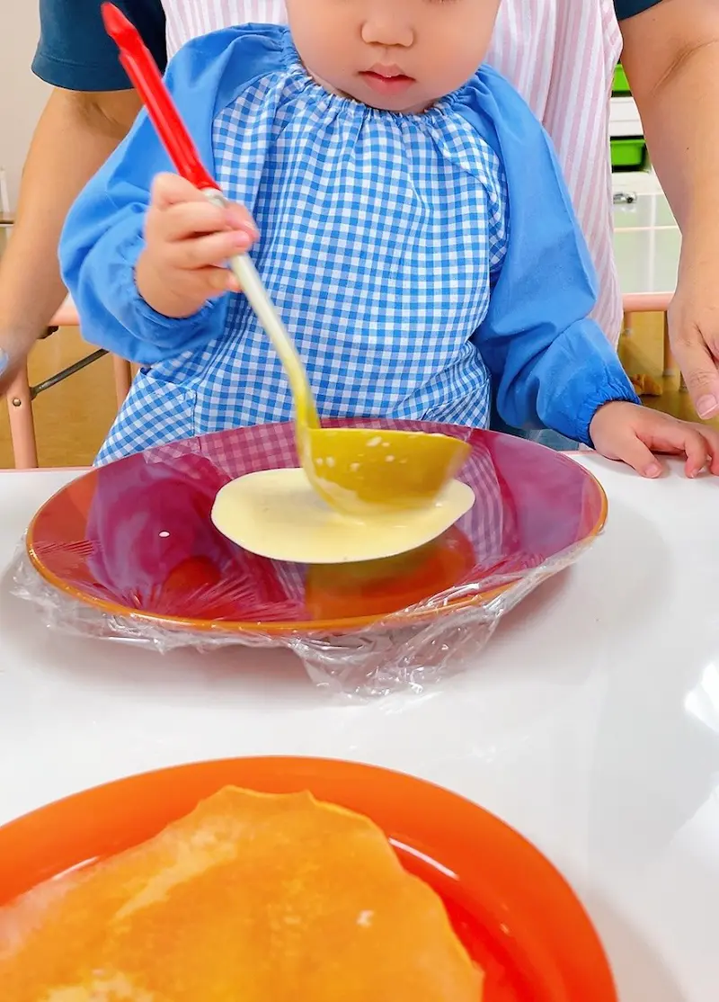 みんながお楽しみにしているクッキング。今回のメニューはクレープです。生地を丸く伸ばしたり、包丁でバナナを切ったり、クリームを絞ったりと気分はクレープ屋さん。ほと…