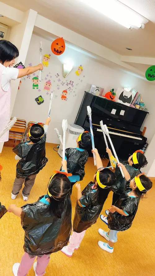 アンファンでも、毎年恒例のハロウィンを楽しみました。教室をコウモリやおばけで飾りつけ。当日は、かぼちゃのおばけに変身して魔法の棒を持ってみんなで魔法をかけました…